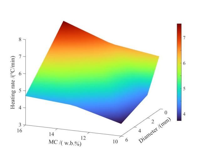 图2 金属化包装内玉米粒直径、水分含量及射频加热速率间的关系模型