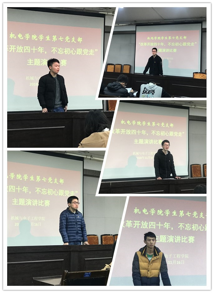 为进一步深入学习宣传贯彻党的十九大精神,加强和改进新时代大学生思想政治工作,引导广大学生深入学习领会习近平总书记关于改革开放的重要思想,培养学生爱国荣校的情怀,结合学校“基层党建和学科建设年”工作部署,尤物视频 学生第七党支部于11月16日下午在学院三楼报告厅举办“改革开放四十年,不忘初心跟党走”主题演讲比赛,五位同志参加比赛,支部全体党员、预备党员参加观摩。