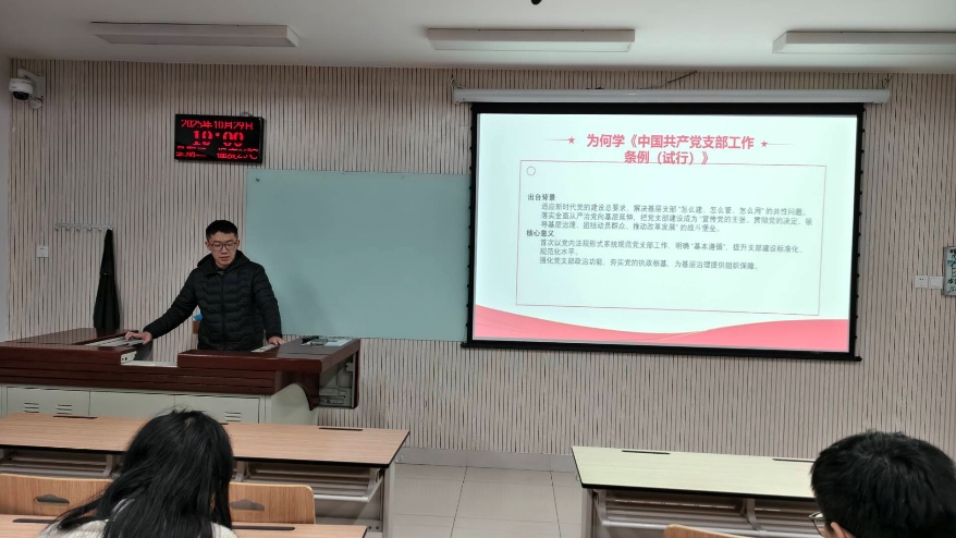 党支部是党的基础组织,是党的全部工作和战斗力的基础。为深入贯彻新时代党的建设总要求,切实解决基层支部 “怎么建、怎么管、怎么用” 的共性问题,推动全面从严治党向基层延伸,10月29日,机电本科生党支部组织开展 “学习《中国共产党支部工作条例(试行)》” 专题政治理论学习,旨在以条例为遵循,提升支部建设标准化、规范化水平,筑牢党的执政根基。