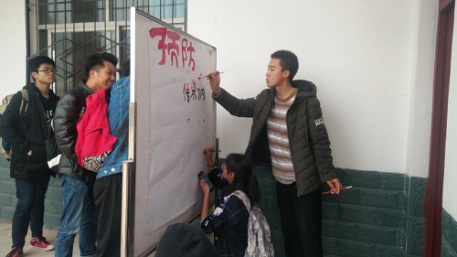 下午两点半,动医和机电的小伙伴们在理学院门口集合完毕。一起骑车去往蒋家寨,开始本次的宣传活动。同学们在活动前一晚召开工作安排会议,提前设计好板报,打印好宣传单,明确每位同学的分工。到达目的地后,大家迅速开始了活动。同学们挨家挨户进行着分发宣传单并就预防传染病知识进行讲解。负责画板报的同学也积极行动起来,画画、写字、调颜料。一切进行的有理有序。
