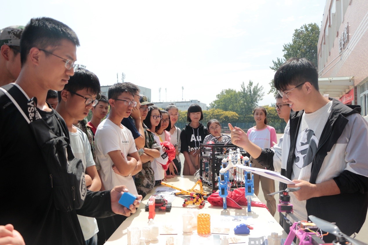 创新引领社会发展,科技把握时代潮流。为激发新生创新意识,强化专业意识,引导让学生将所学知识与实践紧密结合,9月9日,尤物视频 于篮球场组织开展了以“科技创新”为主题的特色科技成果展示,以创客之家的科技创新成果为载体,面向2018级新同学展示了近年来迅猛发展的智能装备与机器人。