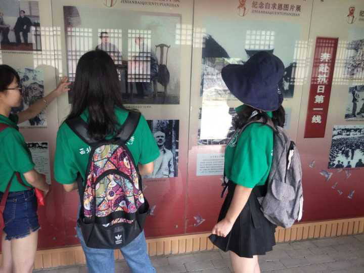 队员们认真的参观了白求恩图片展,向工作人员了解了很多历史,包括毛泽东主席亲自在凤凰山下会见了这位不远万里来到中国的国际共产主义战士,以及白求恩同志为伤病员治疗的场景。队员们了解到白求恩同志不仅诊治过许多伤病员,还为抗日军政大学等作了报告,并且考察了当地的风土人情。在白求恩的日记摘抄里——“虽然延安是中国最古老的城市,但我很快觉得它是管理的最好的一个城市,和我在汉口看到的一片混乱,优柔寡断、昏庸无能的官僚政治主义和令人灰心的现象截然不同”——队员们加深了对国际共产主义精神,延安革命精神的认识和理解。白求恩同志作为一名外国人却时时刻刻把中国人的伤痛,患者的伤痛作为自己的痛,他对工作极端的负责任对同志对人民的极端热忱是无人可比拟的。