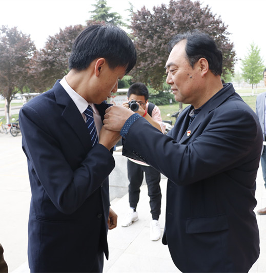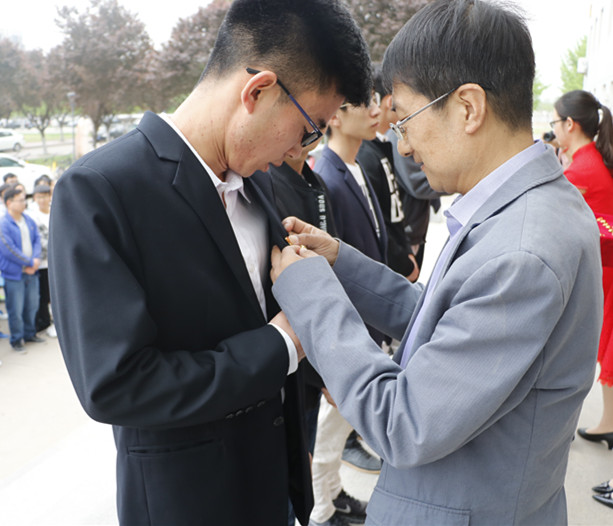 随后,学院党委书记戴军老师、党委副书记张朝红老师为各学生党支部的党员代表佩戴党徽。