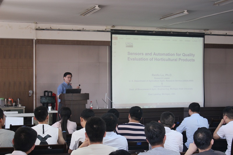 6月22日下午,美国农业部农业研究院(USDA/ARS)驻密歇根州立大学研究所所长、资深研究员,密歇根州立大学生物系统与农业工程系兼职教授卢仁富博士为师生做了题为《Sensors & Automation for Quality Evaluation of Horticultural Products》的学术报告。尤物视频 何东健教授主持报告会并简要介绍了卢仁富博士的学术成就。