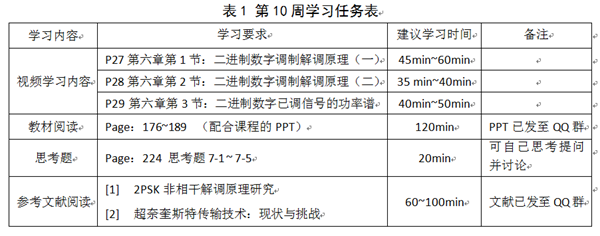 为了督促学生按时完成学习任务,制定每周学习的具体内容并提前下发学生,同时明确对内容的学习要求,精确到每周、每节课的具体要求,让学生清楚学习的任务边界。比如,每周通过QQ学习群,向学生布置下周的学习安排;每部分的视频内容,参考书阅读内容,以及思考题内容,等等。比如下表是第10周的学习任务。