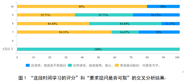 由图1可见,打高分的学生中,80%的学生认同“要求提问”的做法。