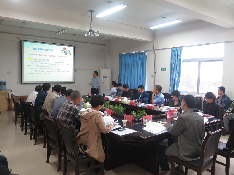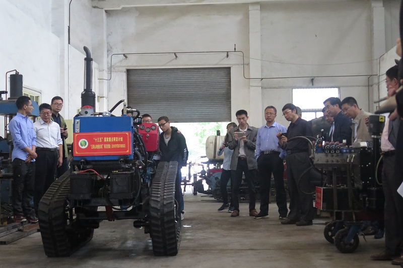 中期检查采取会议汇报、材料审核和现场检查的方式进行。会议期间,课题技术负责人刘志杰老师从课题中期指标及完成情况、课题开展的主要工作、课题取得的重要成果、课题经费使用情况和后期工作计划安排几个方面进行了汇报。课题组成员在前两年的研究工作中,主要根据拖拉机相关国家标准以及性能要求,完成全姿态调整轮式拖拉机设计,并进行了主要部件的加工制作;完成山地履带拖拉机姿态调平系统的构建和性能测试;完成遥控履带拖拉机原理样机的设计、加工和装配;完成山地履带拖拉机负载试验装置的构建。同时,该课题组发表相关SCI论文2篇,EI论文2篇,发明专利公开多项,实用新型专利授权5项。