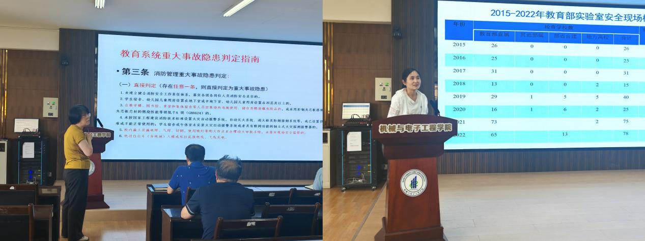 学院中心实验室主任韩冰带领与会人员系统学习《教育系统重大事故隐患判定指南》,针对实验室、实训场所等重点区域,从电气安全、危化品管理、设备操作规范等维度,详细解读关键风险点及判定标准,为后续精准辨识隐患、科学治理隐患提供了明确技术依据。