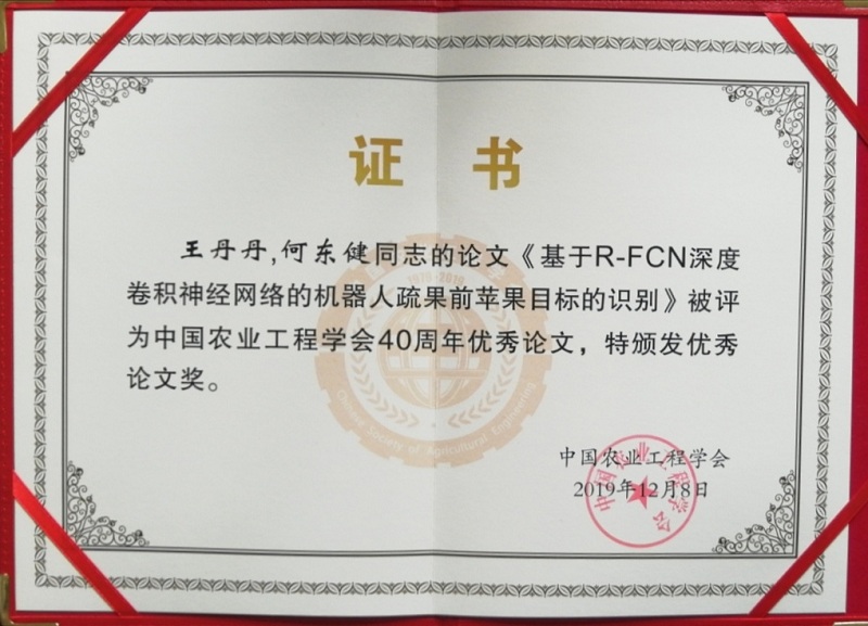 尤物视频 何东健教授的《基于R-FCN深度卷积神经网络的机器人疏果前苹果目标的识别》、傅隆生副教授和崔永杰教授的《基于卷积神经网络的田间多簇猕猴桃图像识别方法》两篇论文荣获中国农业工程学会40周年优秀论文奖。