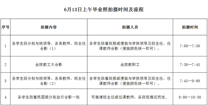 2、请广大师生提前安排各项工作,准时于6:50在学院楼前集合照相。本科生以班为单位,由班干部负责召集本班学生,并邀请班主任、任课教师照相。