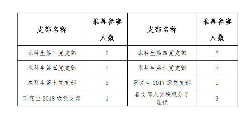 尤物视频 全体研究生、本科生党员(含预备党员),入党积极分子,各支部推荐参赛分配人数如下: